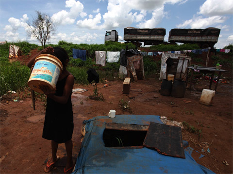 | A girl drinking water from a bucket at a roadside camp in Mato Grosso. Photo: Rodrigo Baleia |