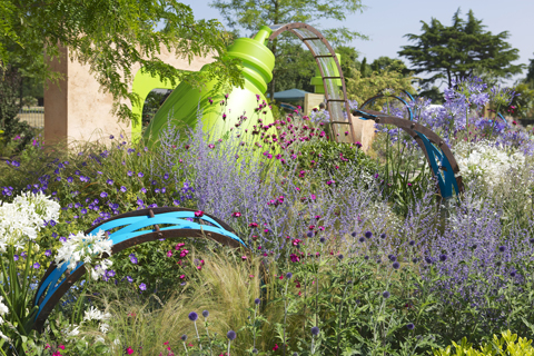 The Ecover Garden is based on the fundamental principle that water is life, and that while we depend upon our aquatic environments, we simultaneously threaten them with pollution, from waste plastic in the oceans and toxic residues in our rivers and lakes. The key message promoted throughout the garden is sustainability, with sustainable materials used in the garden, including recycled plastics, lime render and mulched beds to reduce water loss. Plastic is used in innovative ways, with a toilet cleaner fountain, bottle handle bench and laundry cap lamp, reflecting sponsor Ecover's ecologically sound cleaning products.