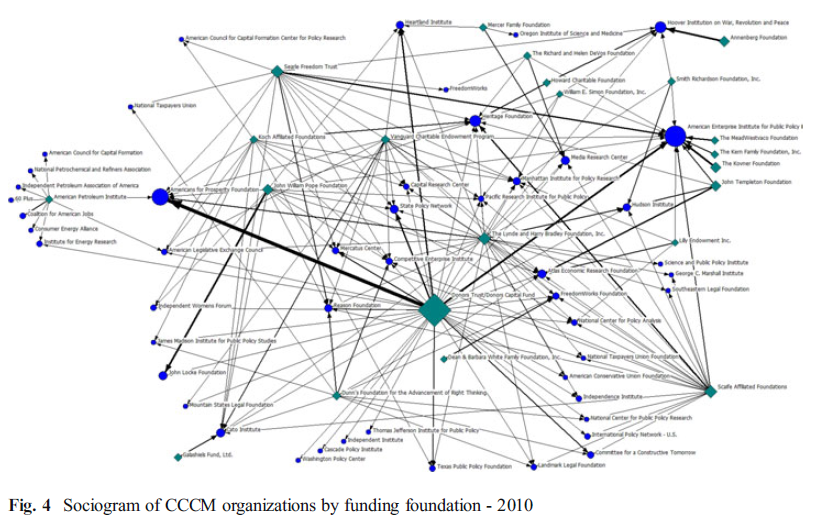 This chart from Dr. Brulle's report shows the complex interconnection of the Beast's major players. The green diamonds are the big funders: the Koch-affiliated foundations, the Scaife-affiliated foundations, the American Petroleum Institute, and so on.