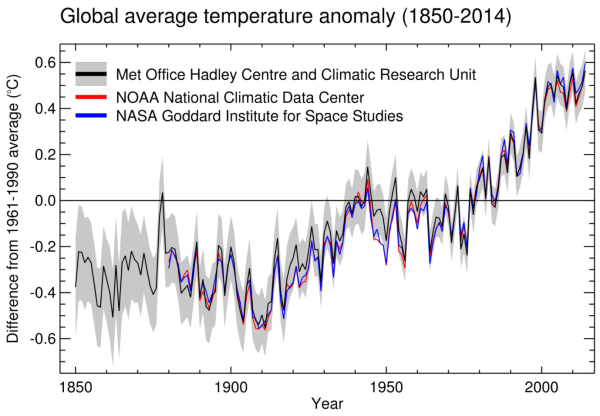Average global air temperatures over land and sea surface in 2014 were 0.57 °C above the long-term average of 14.00°C (57.2 °F) for the 1961-1990 reference period.