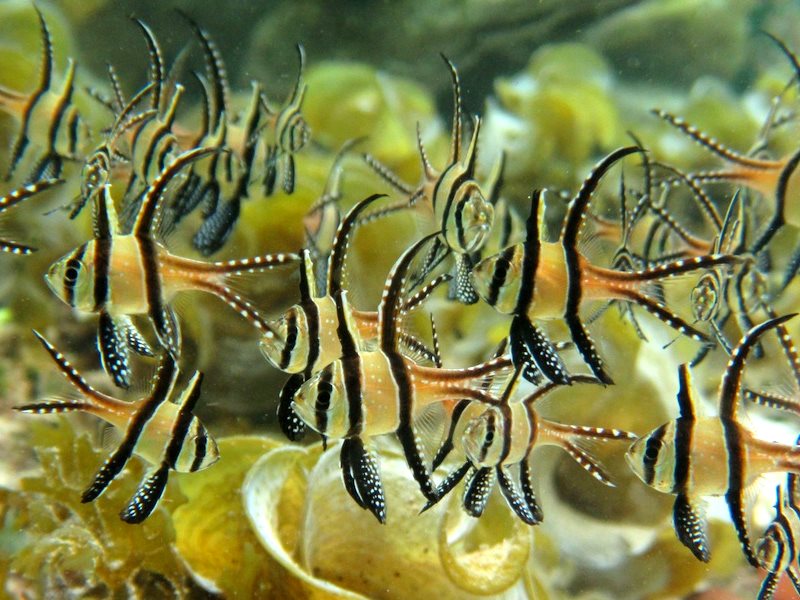 Young and adult fish need sea urchins, anemones and branching corals as protection. But because Banggai Cardinalfish live in such shallow waters, this makes them vulnerable. Equipped with a diving mask and a hand net, a man can fish a whole group of Banggai Cardinalfish in a few minutes.