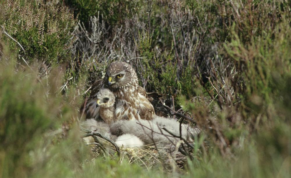 A Hen harrier nesting with her chicks, Scotland