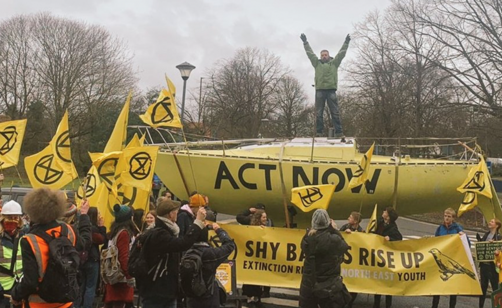 Chris Riches, an XR activist who travelled from Newcastle, explains that the demonstration is an escalation from earlier actions this month: "The first week a letter was sent to the council, asking them not consider the expansion, then there was a small protest at Durham County council and XR Youth led and blocked the entrance to Banks Group. This is now the forth and final week of action."