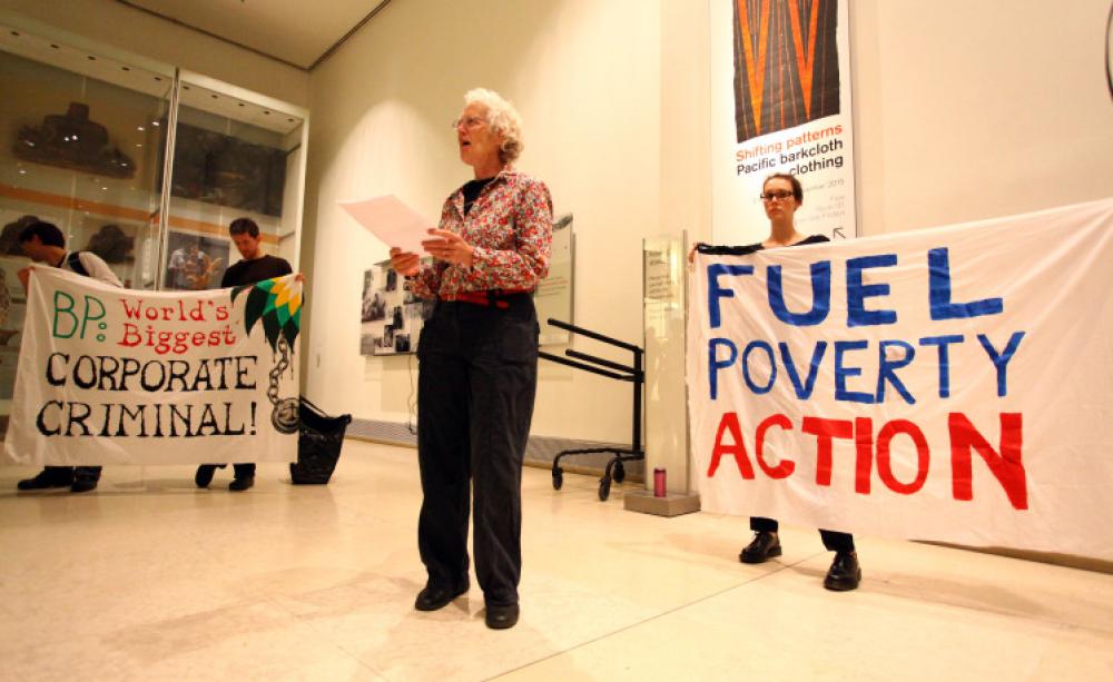 Ruth London from Fuel Poverty Actions performs her poem inside the BP-sponsored British Museum as part of the Art Not Oil protest festival. Photo by Natasha Quarmby/Fields of Light Photography