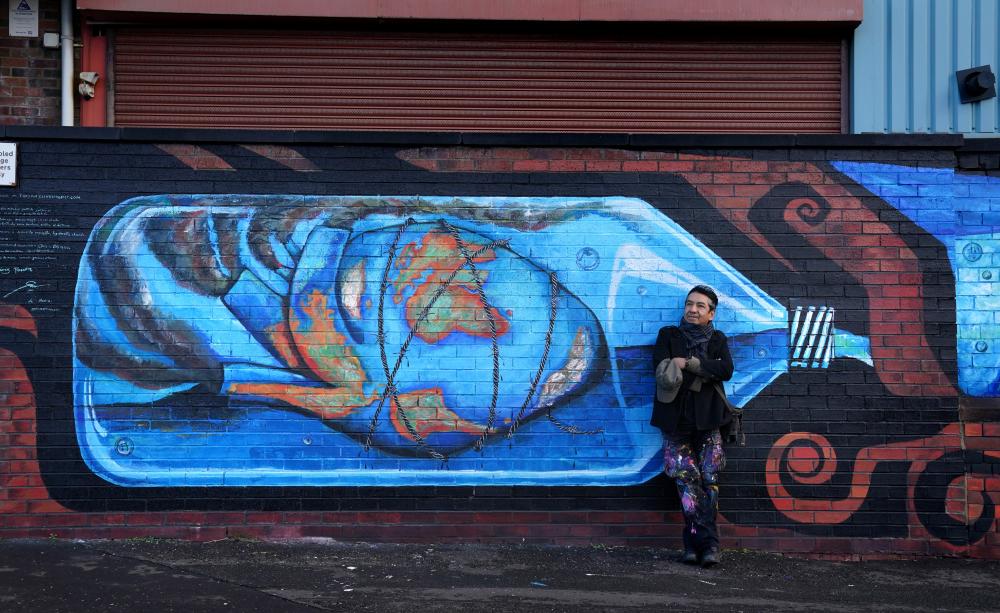 Mexican artist and activist, Gustavo Chavez Pavon in front of mural he painted on the side of the Scottish Opera Production Studios in Glasgow to coincide with COP26.