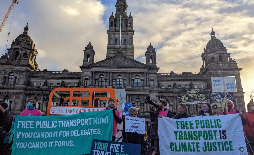 Glasgow demonstration for free public transport at COP26, in 2021. Image: (c) Michal Rozworski / Used with permission.