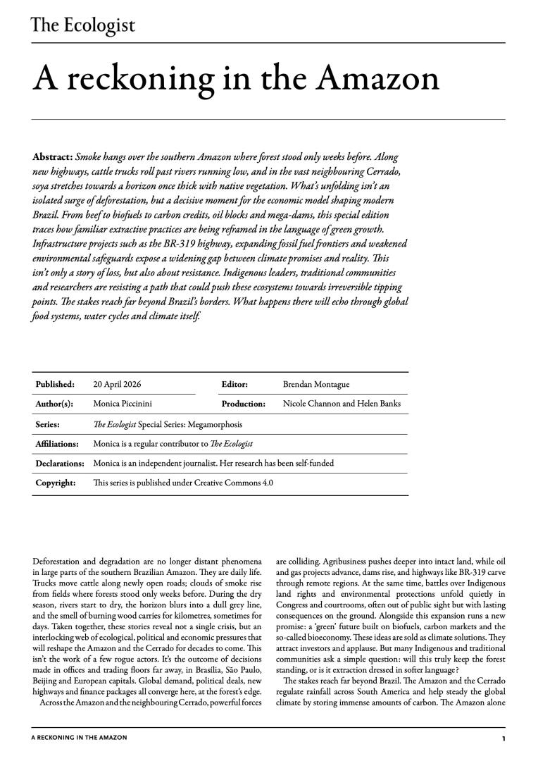 From beef to biofuels to carbon credits, oil blocks and mega-dams, this special edition traces how familiar extractive practices are being reframed in the language of green growth. Infrastructure projects such as the BR-319 highway, expanding fossil fuel frontiers and weakened environmental safeguards expose a widening gap between climate promises and reality. This isn’t only a story of loss, but also about resistance.